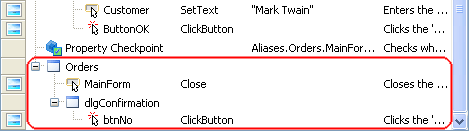 Как видите, TestComplete автоматически объединяет записанные операции в группы, соответствующие процессам и окнам, с которыми вы работали. Группировка делает структуру теста более удобной для понимания, а также помогает понять иерархию объектов, существующую в тестируемом приложении. Мы записали действия пользователя над одним процессом ( Orders ), поэтому в нашем случае, мы имеем одну группирующую строку, соответствующую процессу и содержащую все действия, которые мы эмулировали над процессом и его окнами. Действия, которые мы совершали над окнами и элементами управления, объединены в группы, которые соответствуют этим окнам и принадлежат группе процесса: